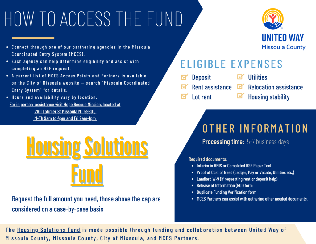 The Housing Solutions Fund is made possible through funding and collaboration between United Way of Missoula County, the Human Resource Council, Hope Rescue Mission, the City of Missoula and Missoula County.